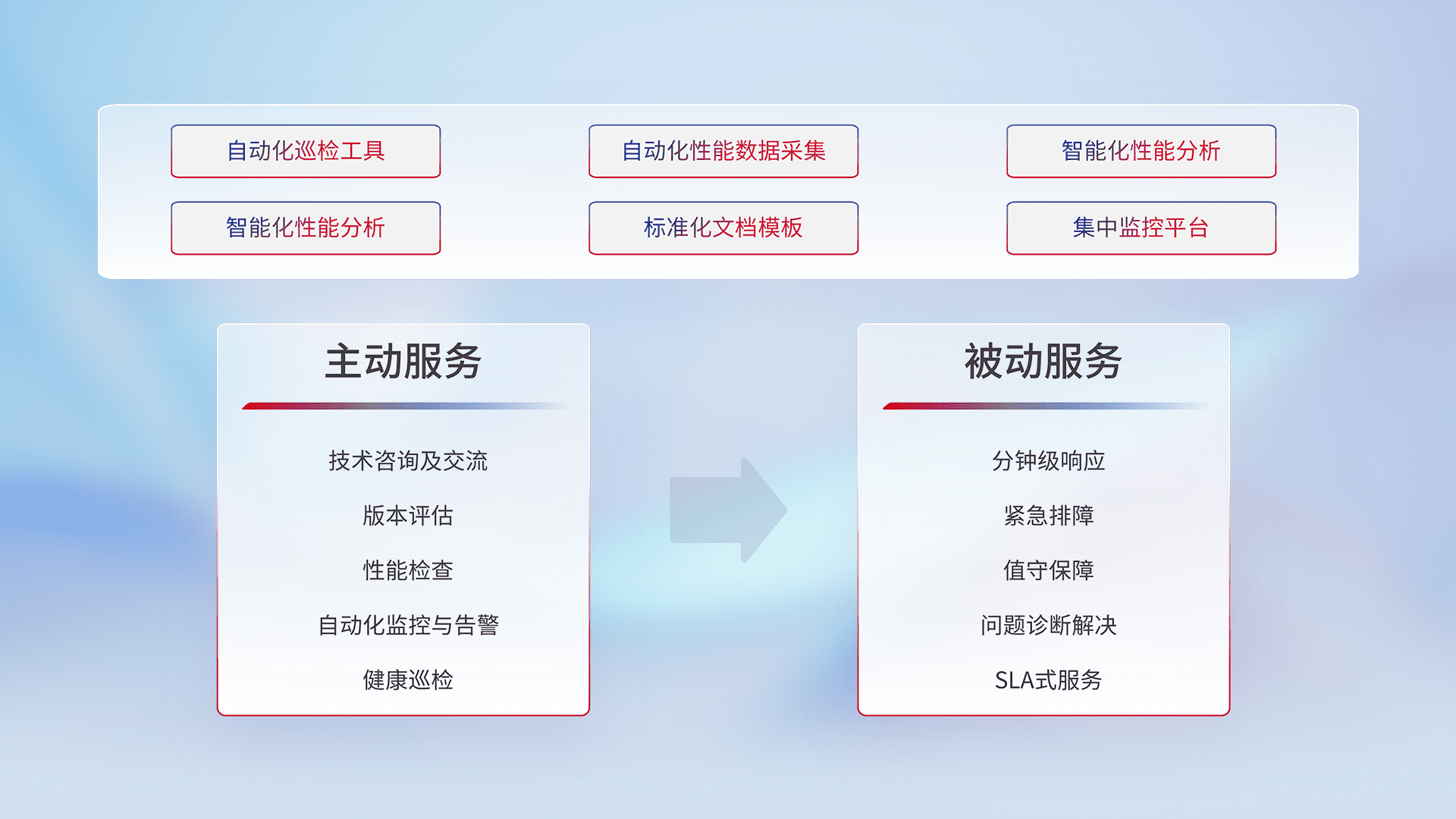 智能化工具和标准化文档,,,保障服务质量,,,提供主动服务(包含技术咨询、、、、版本评估、、、性能检查、、、、自动化监控与告警、、、、健康巡检)和被动服务包含(分钟级响应、、、、紧急排障、、、值守保障、、、问题诊断解决、、、SLA服务)。。