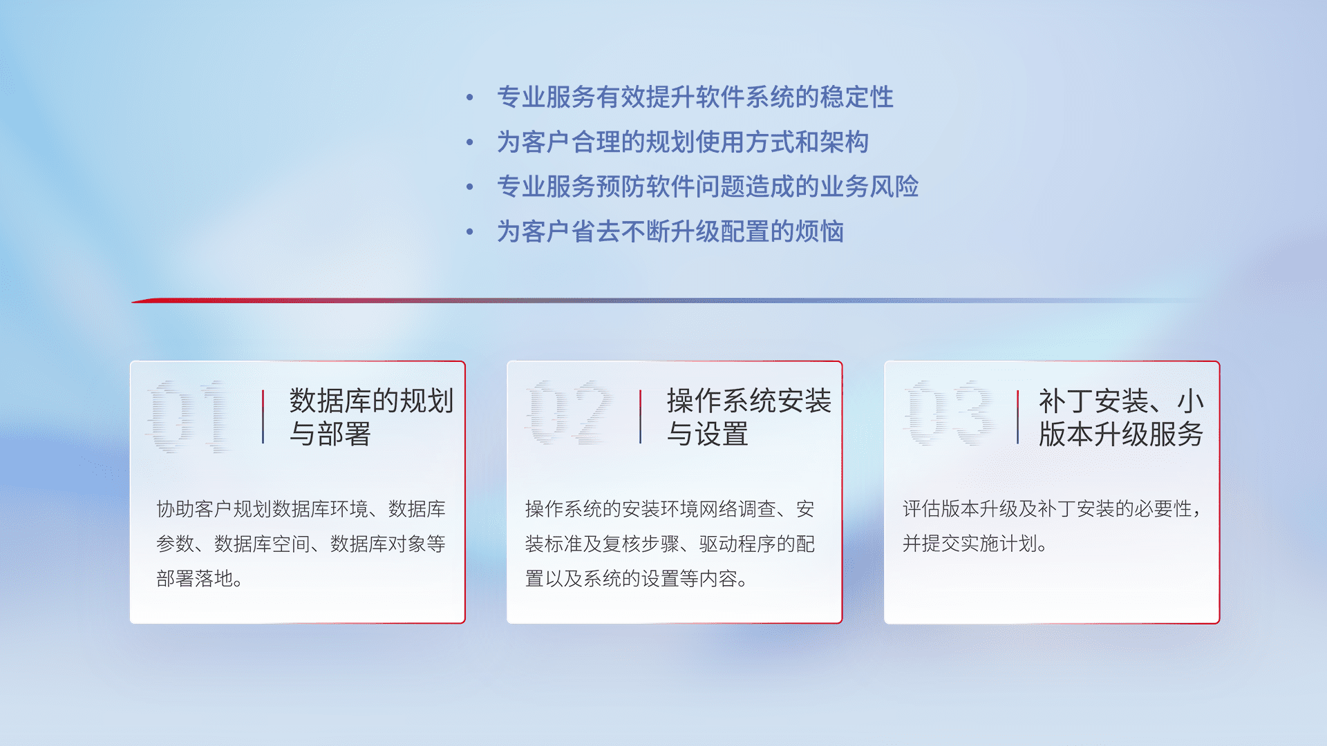 为客户提供软件规模升级、、、、快速部署、、、、按需配置的专业服务,,,,从数据库的规划与部署到操作系统的安装与设置,,,,再到补丁安装和小版本升级提供支持。。